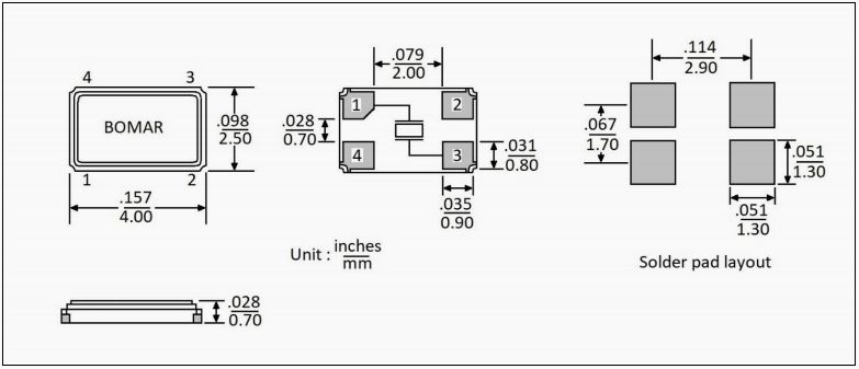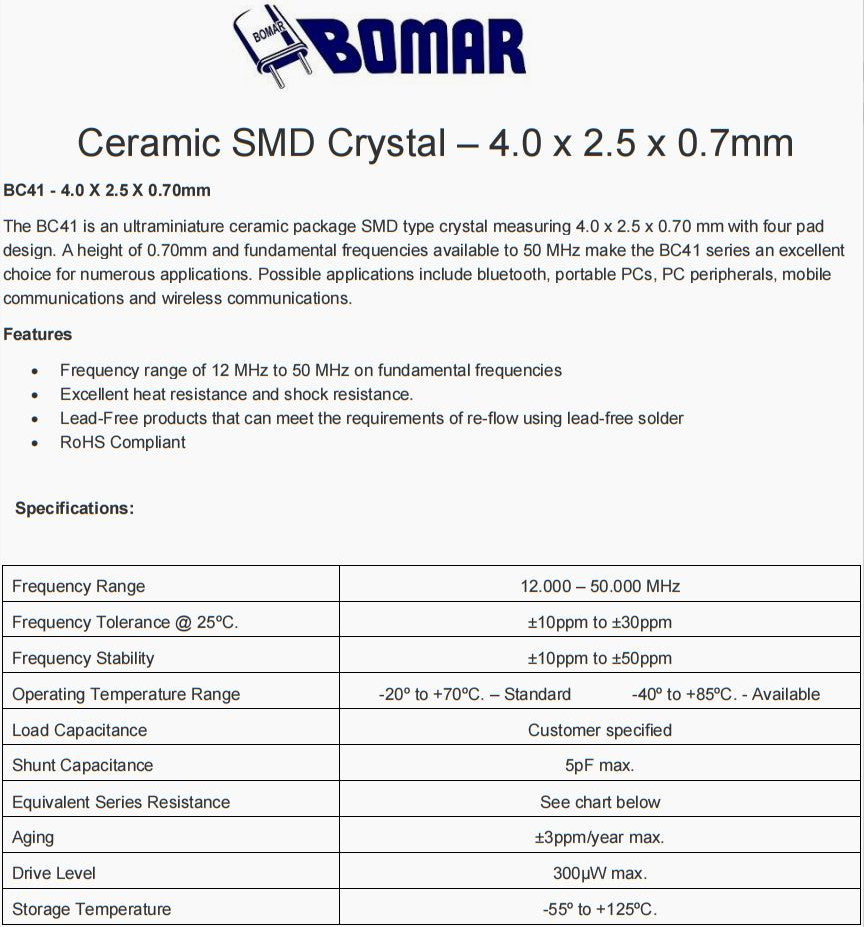 Bomar石英晶振,6G網(wǎng)絡(luò)傳輸晶振,BC41EFD120-24.000000四腳晶振,美國(guó)Bomar晶振公司,進(jìn)口晶振,歐美晶振,SMD晶振,BC41晶振,小體積晶振,無(wú)源晶振,貼片晶振,四腳晶振,6G路由器晶振,6G信號(hào)接收器晶振,4025晶振,石英晶振,BC41是一款尺寸為4.0 x 2.5 x 0.70 mm的超微型陶瓷封裝SMD型晶體,采用四焊片設(shè)計(jì)。0.70mm的高度和50 MHz的基頻使BC41系列成為眾多應(yīng)用的絕佳選擇。可能的應(yīng)用包括藍(lán)牙、便攜式個(gè)人電腦、個(gè)人電腦外圍設(shè)備、移動(dòng)通信和無(wú)線通信。