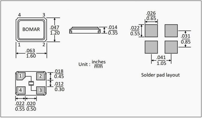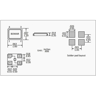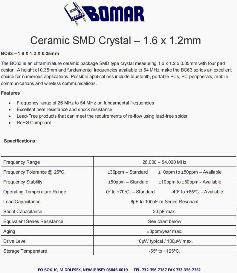 Bomar無(wú)源晶振,BC41EFD120-37.400000四腳晶振,無(wú)人機(jī)信號(hào)接收器晶振,美國(guó)Bomar晶振公司,進(jìn)口晶振,歐美晶振,BC63晶振,1612晶振,石英晶振,超小型晶振,無(wú)源晶振,貼片晶振,四腳晶振,6G路由器晶振,6G通訊設(shè)備晶振,BC63是一款尺寸為1.6 x 1.2 x 0.35mm的超微型陶瓷封裝SMD型晶體,采用四焊片設(shè)計(jì)。0.35mm的高度和54 MHz的基頻使BC63系列成為眾多應(yīng)用的絕佳選擇??赡艿膽?yīng)用包括藍(lán)牙、便攜式個(gè)人電腦、個(gè)人電腦外圍設(shè)備、移動(dòng)通信和無(wú)線通信
