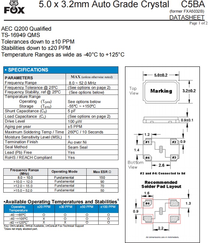 | FC5BACBEI26.0-T1 | Fox 晶振 | C5BA | 26 MHz | ±50ppm | ±30ppm | 10pF |