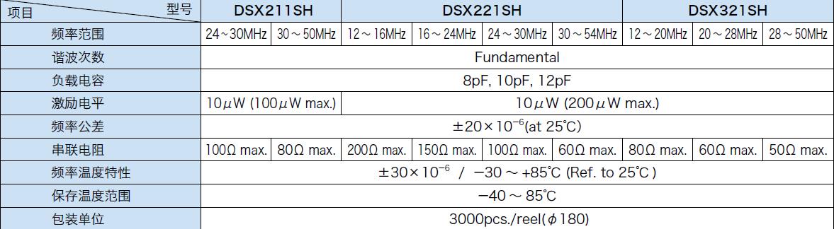 頻率范圍 12.000~50.000MHz,負載電容 8pF, 10pF, 12pF,激勵電平 10μW (200μW max.),頻率公差 ±30×10-6(at 25℃),串聯(lián)電阻 120Ω max. 100Ω max. 80Ω max.,頻率溫度特性 ±100×10-6 / -40 +125℃ (Ref. to 25℃),保存溫度范圍 -40 +150℃.