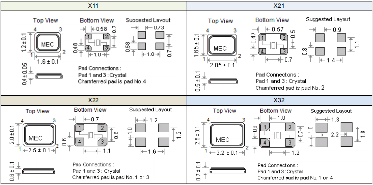 | 項(xiàng)目/型號 | X11 ( 1.6 * 1.2 * 0.4 mm ) | X21 ( 2.0 * 1.6 * 0.5 mm ) | X22 ( 2.5 * 2.0 * 0.6 mm ) | X32 ( 3.2 * 2.5 * 0.7 mm ) |