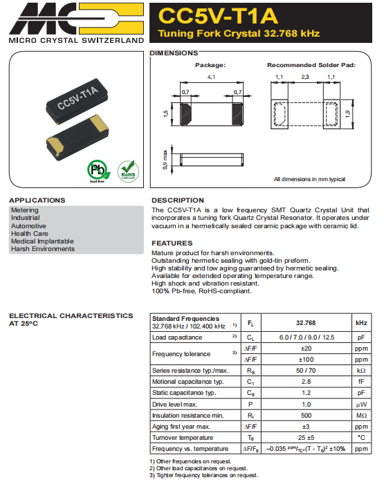 CC5V-T1A-32.768kHz-12.5pF-20PPM-TA-QC,Micro無源晶振,4115mm 特點(diǎn):