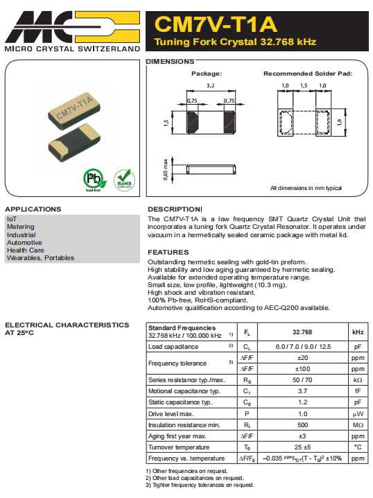 CM7V-T1A-32.768kHz-12.5pF-20PPM-TA-QC|瑞士微晶晶振|3215mm貼片晶振,瑞士微晶晶振,CM7V-T1A無源晶振,CM7V-T1A-32.768kHz-12.5pF-20PPM-TA-QC晶振,3215mm晶振,石英貼片晶振,小體積晶振,32.768KHZ晶振,負(fù)載12.5pf,工作溫度-40~85°C,可穿戴設(shè)備晶振,便攜式設(shè)備晶振,物聯(lián)網(wǎng)晶振,車載晶振,衛(wèi)生保健應(yīng)用晶振,工業(yè)設(shè)備晶振.
