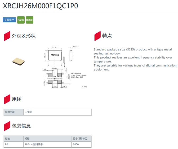XRCJH26M000F1QC1P0|26MHz|-30~85℃|8pf|3225,編碼XRCJH26M000F1QC1P0,型號為TAS-3225J,頻率26MHz,工作溫度-30~85℃,負(fù)載8pf,尺寸大小3225mm,數(shù)字通信設(shè)備晶振,5G室外基站晶振,工業(yè)設(shè)備晶振,無線通訊設(shè)備晶振.