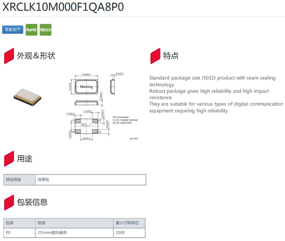 XRCLK10M000F1QA8P0|10MHz|-30~85℃|8pf|5032mm,XRCLK10M000F1QA8P0晶振,頻率10MHz,工作溫度-30~85℃,負載8pf,尺寸5032mm,高可靠性晶振,無線通訊設備晶振,WIFI晶振,通信設備晶振,數(shù)碼相機晶振,醫(yī)療設備晶振.