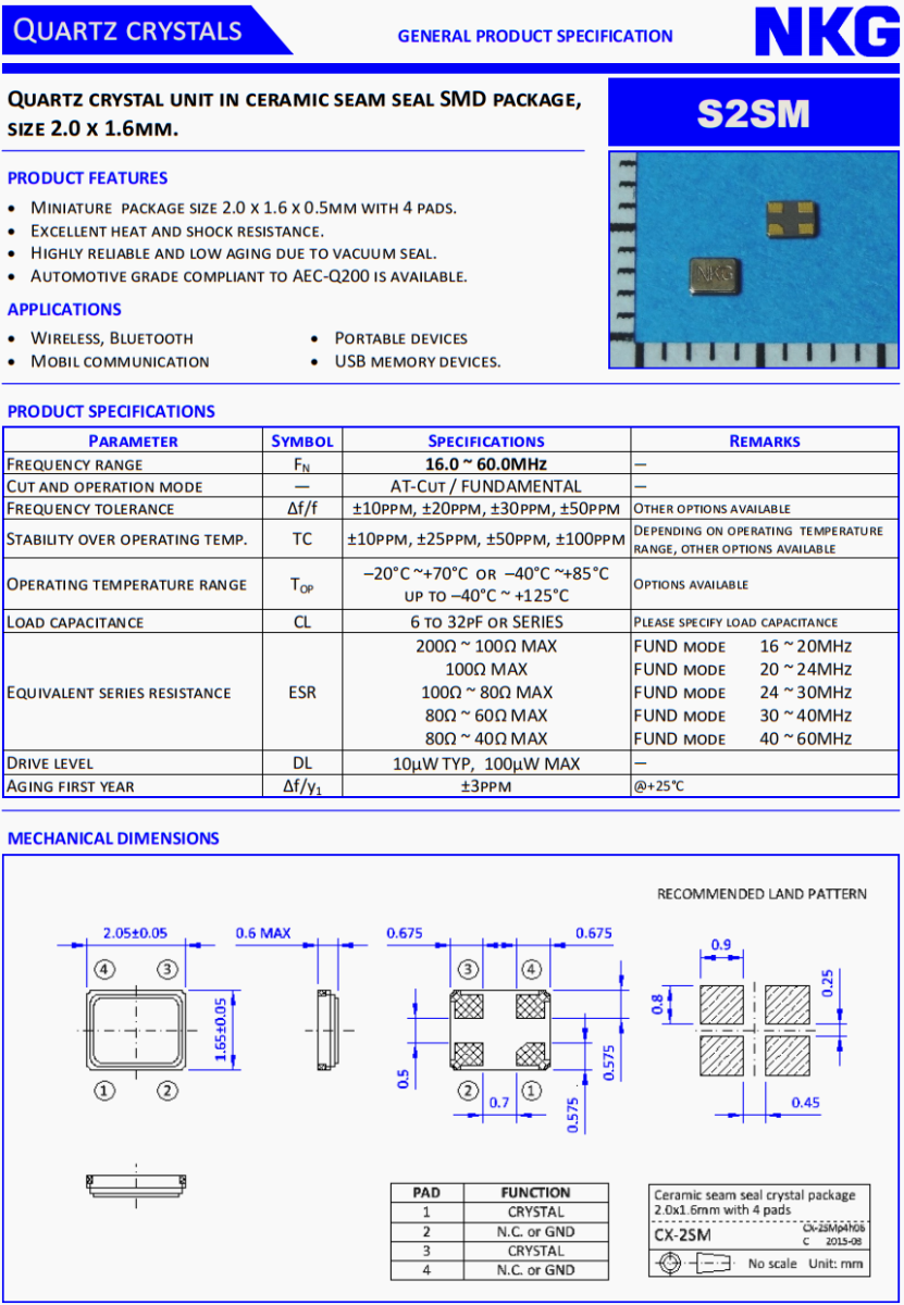 NKG超小型晶體,胎壓監(jiān)測(cè)裝置晶振,S2SM24.5760F12MYY-EXT貼片晶振,NKG晶振公司,無(wú)源晶振,貼片晶振,超小型晶振,2520晶振,液晶儀表盤(pán)晶振,石英晶振,耐高溫晶振,汽車(chē)多媒體設(shè)備晶振,6G通訊設(shè)備晶振,6G網(wǎng)絡(luò)終端晶振,無(wú)源晶振,貼片晶振。石英晶體單元在陶瓷縫密封SMD封裝,尺寸25. x 2.0mm。產(chǎn)品特點(diǎn):微型包裝尺寸2.5 x 2.0 x 0.5mm,有4個(gè)襯墊。優(yōu)異的耐熱性和抗震性。真空密封,可靠性高,老化率低。符合AEC-Q200標(biāo)準(zhǔn)的汽車(chē)級(jí)產(chǎn)品可供選擇。應(yīng)用范圍:無(wú)線、藍(lán)牙、移動(dòng)通訊、便攜設(shè)備、USB存儲(chǔ)設(shè)備