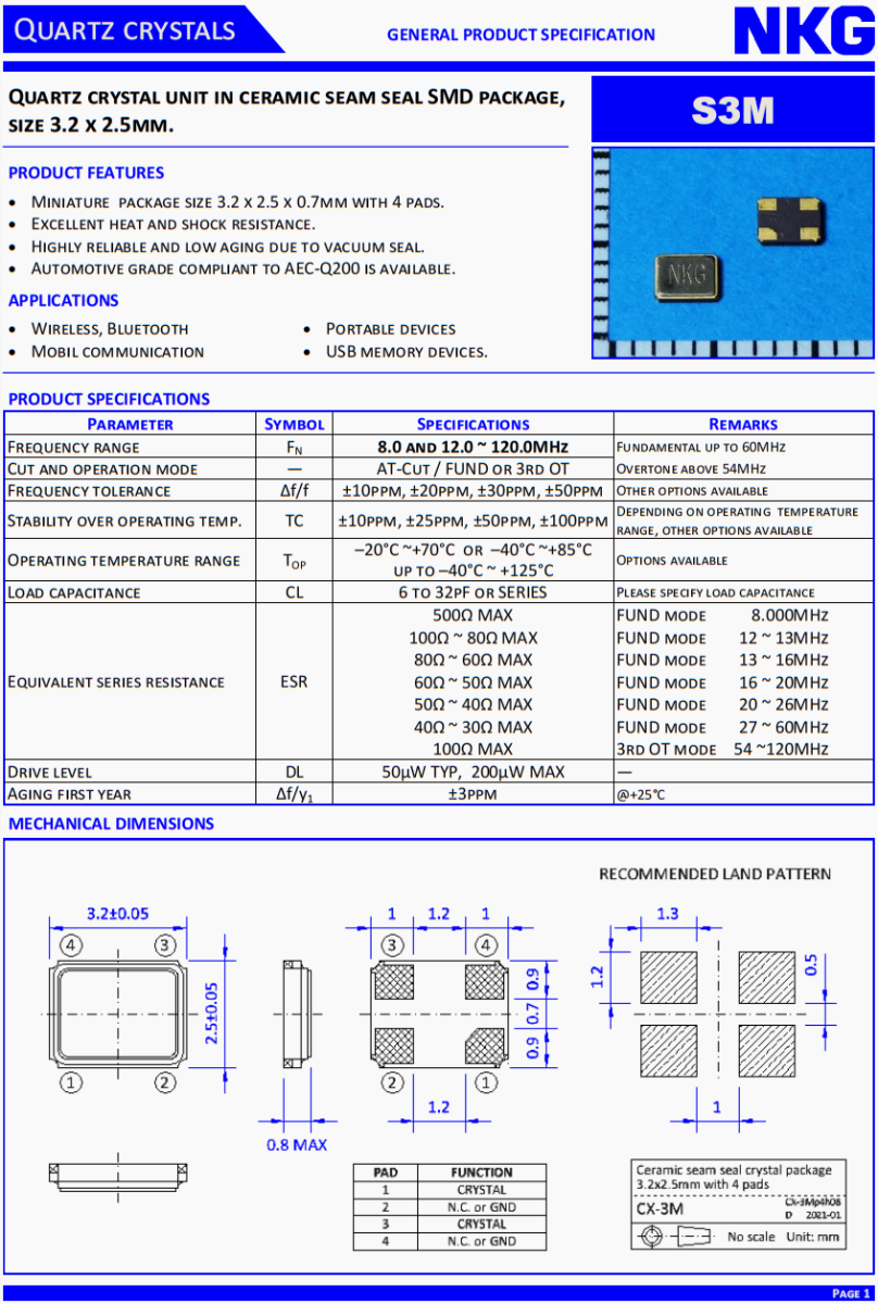 汽車胎壓監(jiān)測裝置晶振,NKG3225晶振,S3M54.0000F12M23-EXT優(yōu)質(zhì)晶振,NKG晶振公司,無源晶振,貼片晶振,超小型晶振,3225晶振,液晶儀表盤晶振,石英晶體單元在陶瓷縫密封SMD封裝,尺寸3.2 x 2.5mm。產(chǎn)品特點:微型包裝尺寸3.2 x 2.5 x 0.7mm,有4個襯墊。優(yōu)異的耐熱性和抗震性。真空密封,可靠性高,老化率低。符合AEC-Q200標準的汽車級產(chǎn)品可供選擇。應用范圍:無線、藍牙、移動通訊、便攜設(shè)備、USB存儲設(shè)備,石英晶振,耐高溫晶振,汽車多媒體設(shè)備晶振,6G通訊設(shè)備晶振,6G網(wǎng)絡(luò)終端晶振,無源晶振,貼片晶振。