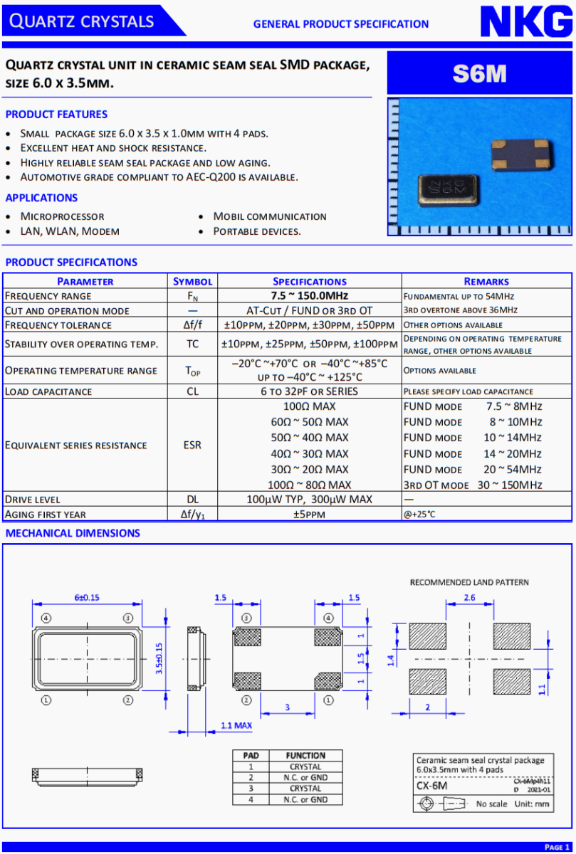 - 產(chǎn)品描述:多功能方向盤晶振,NKG晶振,S6M100.0000F18EYY-EXT四腳晶振。石英晶體單元在陶瓷縫密封SMD封裝,尺寸6.0x3.5mm。S6M。產(chǎn)品特點:小包裝尺寸6.0x3.5x1.0mm與4個墊。優(yōu)異的耐熱性和抗震性。高可靠的縫封封裝,低老化。符合...