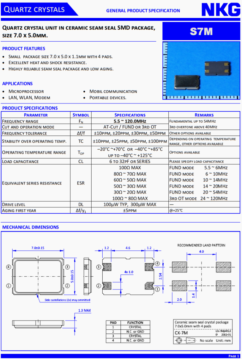 NKG7050晶振,S7M120.0000F18MYY-EXT晶振,車載氛圍燈晶振,。NKG晶振公司,無線傳輸晶振,汽車藍牙晶振,移動通訊晶振,石英晶振,石英晶體單元在陶瓷縫密封SMD封裝,尺寸7.0 x 5.0mm。S7M。產品特點:小包裝尺寸7.0 x 5.0 x 1.1mm, 4個襯墊。優(yōu)異的耐熱性和抗震性。高可靠的縫封封裝,低老化。應用:微處理器,局域網,無線局域網,調制解調器,移動通信,便攜式設備。高品質晶振,低損耗晶振,汽車級晶振,車載音響系統(tǒng)晶振,便攜設備晶振,USB存儲設備晶振。4025晶振,小體積晶振,超薄晶振,貼片晶振,進口晶振,
