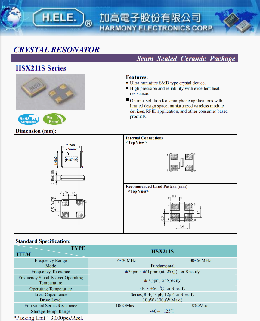 | X2C016000B81H-HPU | 加高晶振 | HSX211S | 16 MHz | ±20ppm | 8pF |