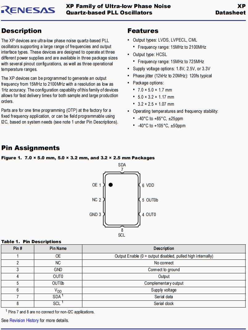 | XPC536020.000000I | Renesas晶振 | XP | 20 MHz | CML | 3.3V |