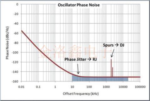 圖3顯示了相位噪聲特性與相位抖動(dòng)之間的關(guān)系.總抖動(dòng)(TJ)是確定性抖動(dòng)(DJ)與隨機(jī)抖動(dòng)(RJ)的總和.在具有如圖3所示的晶振相位噪聲特性的系統(tǒng)中,代表通信環(huán)路帶寬(RJ)(圖3中的藍(lán)色部分)的12k-20MHz范圍的積分值之和代表雜散的總抖動(dòng)(DJ).