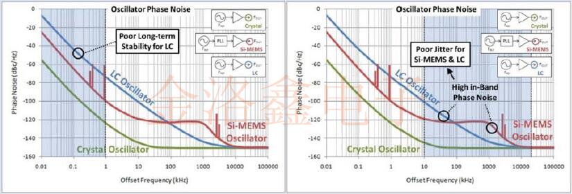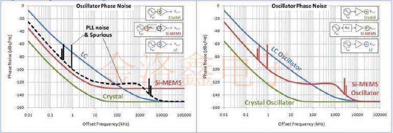 最后,對于三種類型的振蕩器,使用晶體單元作為振蕩源的基本諧波振蕩器,使用PLL電路設(shè)計(jì)和Si諧振器的Si-MEMS振蕩器,其相位噪聲特性相對于輸出的趨向圖5的右側(cè)顯示了作為振蕩源的LC振蕩器(使用LC振蕩作為振蕩源).