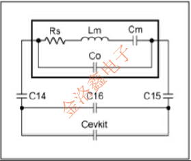 如果使用設(shè)計為使用不同負(fù)載電容振蕩的晶體,則晶體被拉離其規(guī)定的工作頻率,從而在參考頻率中引入誤差.因此,為了將晶體拉回到所需的工作頻率,需要添加外部電容來修改負(fù)載電容.圖3顯示了MAX1470EVKit電路中的晶振.在該電路中,C14和C15是串聯(lián)牽引電容器,而C16是并聯(lián)牽引電容器.Cevkit與MAX1470等效,加上evkitPCB雜散電容.Cevkit大約是5pF.