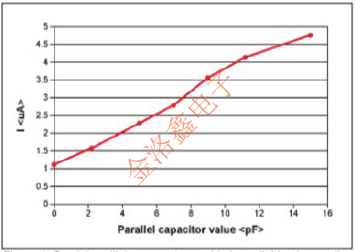 圖4.晶體振蕩器電流與增加的并聯(lián)負(fù)載電容.