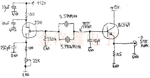 首先,忽略右側(cè)的緩沖電路.忽略標(biāo)記為“測試點”的箭頭右側(cè)的所有內(nèi)容,12V電源連接處添加了10uF電容器,只是因為對連接到電源的較長(可能為1m或更長)雙芯電纜感到內(nèi)gui.首先使用的兩個晶體諧振器是3.579MHz晶體和5.9904MHz晶體,它們在HC49盒中都使用了舊的殼.但是可以調(diào)節(jié)22K微調(diào)電位器,并在不同的設(shè)置下,一個或另一個,或者看似兩個晶體都會振蕩.