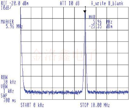 當(dāng)僅示波器探頭連接到這兩個晶體時,探頭本身就充當(dāng)了接地電容.當(dāng)移去探針并將晶體連接到公共集電極晶體管緩沖基極時,發(fā)現(xiàn)有必要在地上增加一些電容.使用10pF,效果很好.結(jié)果非常清楚,它確實同時在兩個晶振頻率上振蕩,首先是高增益,這是5.9904MHz晶體的振蕩: 接下來在較低的增益設(shè)置下,這是3.579MHz晶體振蕩.注意二次諧波,大約降低24dB.通過這個不是低失真線性放大器的公共收集器緩沖器后,就失去了純凈正弦波的頻譜純度.5.9904MHz石英晶體振蕩器也是如此,但是頻譜分析儀掃描僅設(shè)置為0到10MHz.