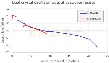 紅線是5.9904MHz,藍(lán)線是3.579MHz.在較低的電阻值下,您可以清楚地看到5.9904MHz晶體振蕩.高于1.5K時,將接管3.579MHz晶體.從大約3K到10K,兩個晶體同時振蕩.這兩個頻率的水平令人驚訝地相似.高于10K時,僅3.579MHz晶體振蕩.