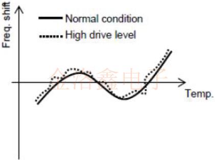 如果諧振器單元的實(shí)際驅(qū)動(dòng)電平大于指定的最大驅(qū)動(dòng)電平,則可能會(huì)出現(xiàn)振蕩頻率異常的溫度特性.這可能是IC功能出現(xiàn)問(wèn)題的原因.