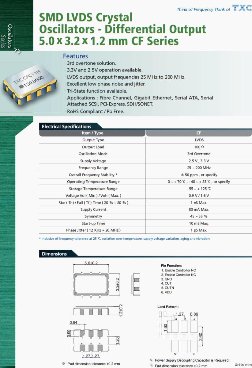 | CF-125.000MBE-T | TXC晶振 | CF | 125 MHz | LVDS | 3.3V | ±50ppm |