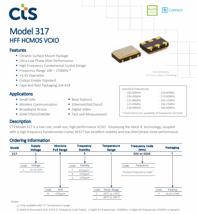 | 317LB3C1250T | CTS | 317 | VCXO | 125 MHz | HCMOS | 3.3V | ±50ppm |