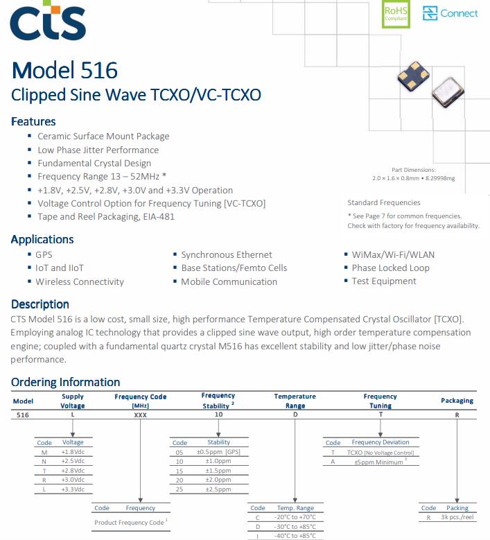 CTS Model 516 is a low cost, small size, high performance Temperature Compensated Crystal Oscillator [TCXO].Employing analog IC technology that provides a clipped sine wave output, high order temperature compensation engine; coupled with a fundamental quartz crystal M516 has excellent stability and low jitter/phase noise performance.