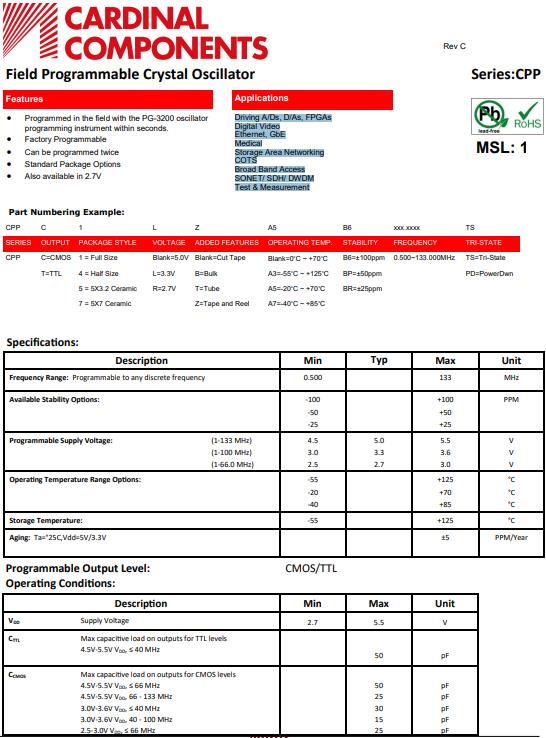 編碼CPPC7L-A7B6-16.0PD是一款尺寸為7.0*5.0mm,XO時鐘振蕩器,有源晶振,頻率16MHz ,輸出CMOS, XO(標(biāo)準(zhǔn)),電壓3.3V ,待機(jī)(斷電,腳位 4-SMD,無引線,具備超高的耐壓性能和穩(wěn)定性能,在現(xiàn)場用PG-3200振蕩器編程編程儀器在幾秒鐘內(nèi)。工廠可編程,可編程兩次,標(biāo)準(zhǔn)包裝選項,也可在2.7V.