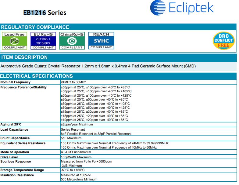 | EB1216JA10-24.000M TR | Ecliptek晶振 | CRYSTAL 24.0000MHZ 10PF SMD |