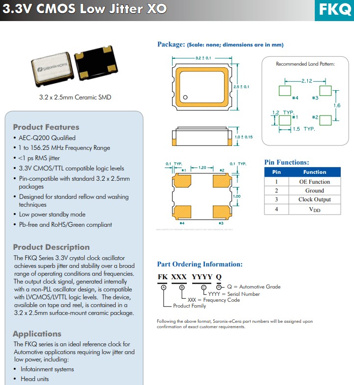 應(yīng)用:FKQ 系列是需要低抖動(dòng)和低功耗的汽車應(yīng)用的理想?yún)⒖紩r(shí)鐘,包括:信息娛樂(lè)系統(tǒng),主機(jī)