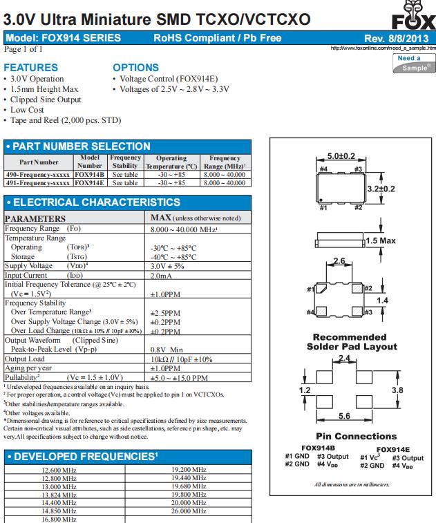 | FOX914B-12.800 | Fox有源振蕩器 | FOX914 | TCXO | 12.8MHz | 3V |