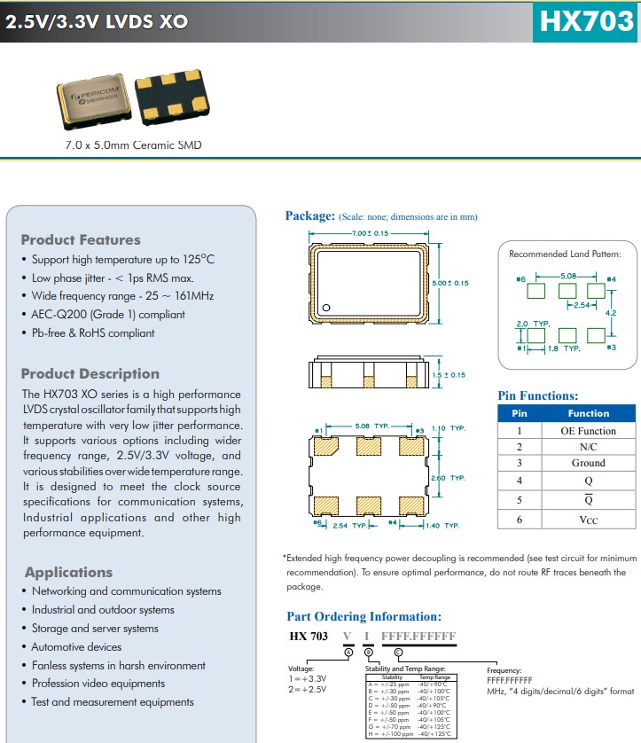 HX703系列滿足通信系統(tǒng)和其他高性能設(shè)備的時鐘源規(guī)范,HX7011C0050.000000,LVDS晶振,ECERA晶振