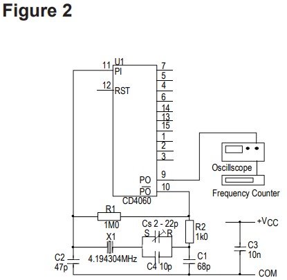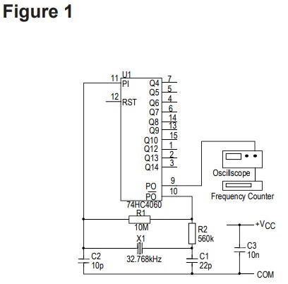 如果需要可微調(diào)振蕩器,22pF輸出電容可以 由一個與2pF至22pF并聯(lián)的固定10pF電容代替 微調(diào)器。為獲得最佳結(jié)果,應(yīng)使用NPO、COG或類似的低溫高效電介質(zhì)電容,以獲得最佳穩(wěn)定性。