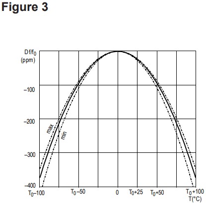 另一個重要的影響是由于溫度的變化。 手表晶體和其他類似類型低于1兆赫有一個拋物線 設(shè)計翻轉(zhuǎn)溫度為25°C時的頻率-溫度特性(見圖3)。人員流動的容忍度 溫度和拋物線曲率常數(shù),通常為3℃ 和0.038 ppm/ C2,這意味著精密公差可以 只能在有限的溫度范圍內(nèi)維持。這沒什么 結(jié)果在一只手表,當然,因為在使用中它保持接近 水晶的周轉(zhuǎn)溫度,但它可以呈現(xiàn)這種選擇晶體類型的成本效益低于AT切割單位,如果操作 希望溫度范圍比0到50℃更寬。4.194304MHz (32.768kHz x 27) AT切割晶體的類似電路 如圖2所示,C3和C4是為了便于精確 在標準時鐘下校準的晶體的頻率調(diào)整 12pF的晶體負載。如果不需要修整,則更換它們 具有18pF或22pF固定單元的電容器(選擇 導(dǎo)致最接近標稱頻率的振蕩),或者省略它們 并指定在30pF負載下校準的晶體。