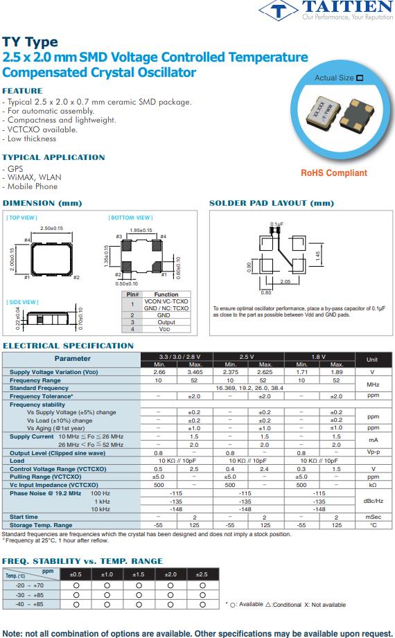 | TYKTCCSANF-19.200000 | Taitien | TY | TCXO | 19.2MHz | 1.8V |