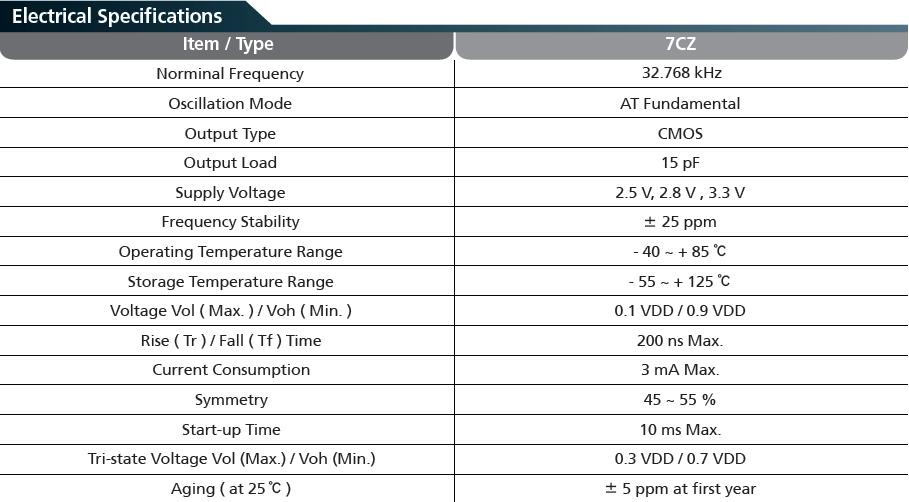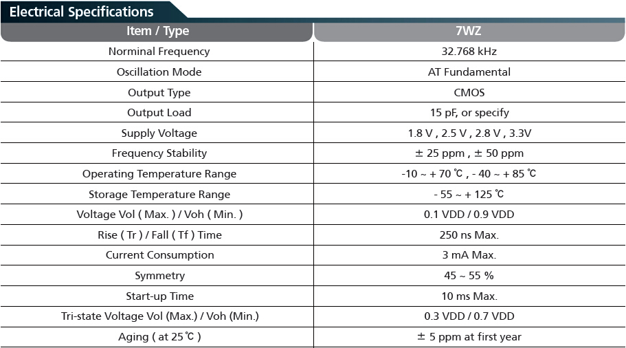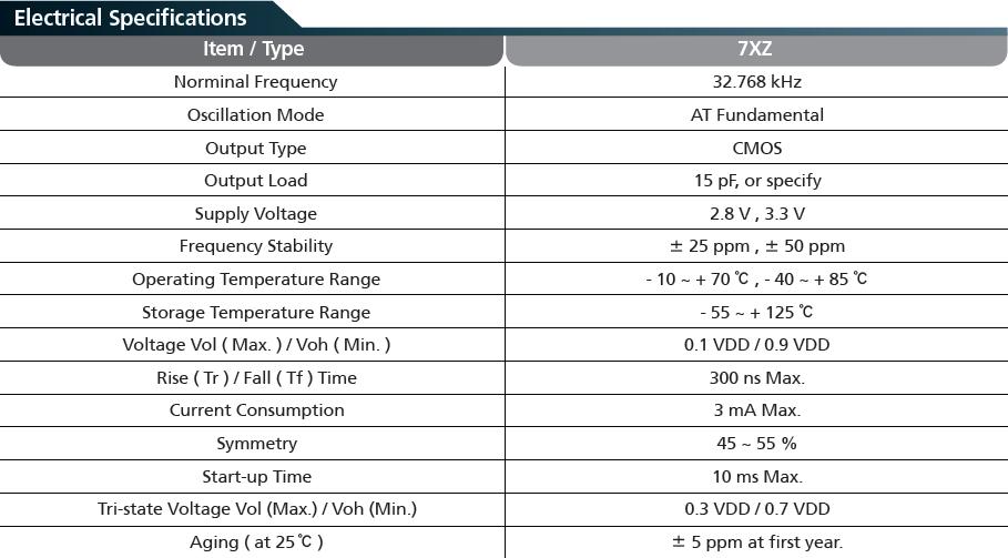 首先出場(chǎng)的是TXC 32.768K有源晶振中體積最大的7WZ石英晶振,參數(shù)如下:
