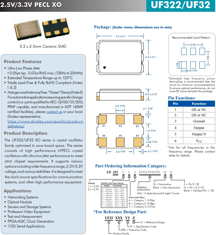 UFQ322/32 20~100 3.2x2.5x0.9 LVPECL 3.32.5 6 2.5V/3.3V、3.2x2.5mm、超低抖動LVPECL晶體振蕩器