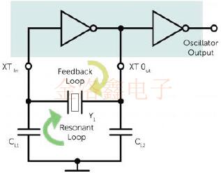 利用具有較低增益裕度[GM]的振蕩器設(shè)計的高級IoT芯片組需要具有低等效串聯(lián)電阻[ESR]和低電鍍電容[C0]的晶體,以確保在較寬的溫度范圍和較低的電池功率水平下快速啟動.許多芯片組[MCU,FPGA和SOC]的RF功能或時序模塊使用片上Pierce振蕩器配置來生成參考時鐘頻率.通常,該模塊是一個反相器放大器,該驅(qū)動器通過添加一個外部石英晶體諧振器[Y1]和兩個負(fù)載電容器[CL1,CL2]來驅(qū)動諧振回路,如圖1所示.可以包括一個附加的反饋電阻以幫助穩(wěn)定直流工作點. 使用芯片組制造商提供的反相放大器的跨導(dǎo)值,可以計算出由放大器反饋環(huán)路和晶振諧振環(huán)路完成的參考時鐘的增益裕度GM.參見圖1.為在所有環(huán)境條件下保證晶體諧振電路的正常工作,增益裕度GM[或安全系數(shù)]至少應(yīng)大于3.0,目標(biāo)目標(biāo)應(yīng)大于5.0.