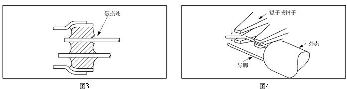 (2)在導(dǎo)腳焊接完畢之后再將導(dǎo)腳彎曲時,務(wù)必請留出大于外殼直徑長度的空閑部分 (參閱圖7)。