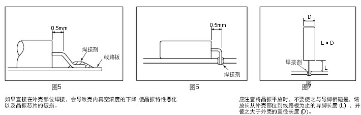 另外,如果利用高溫或長時間對導(dǎo)腳部位進(jìn)行加熱,會導(dǎo)致晶振特性的惡化以及晶振的破損。因此,請注意對導(dǎo)腳部位的加熱溫度要控制在 300°C以下,且加熱時間要控制在5秒以內(nèi) (外殼的部位的加熱溫度要控制在150°C以下)。