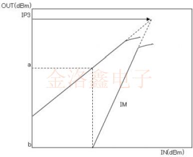 主信號(hào)輸出電平和互調(diào)輸出電平的直線相交的點(diǎn)稱為三階交調(diào)點(diǎn)(IP3).實(shí)際上,它會(huì)飽和到一定的水平,因此線條不會(huì)彼此相交,而要點(diǎn)是,直線區(qū)域不會(huì)按原樣飽和,如果水平升高,則會(huì)相交.
