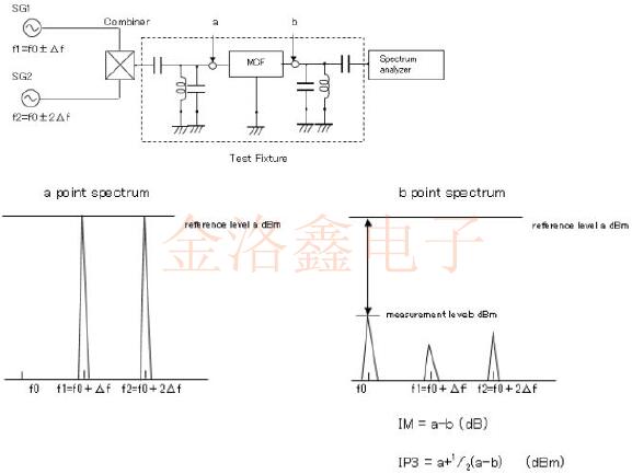 說明濾波器的重要特性——互調(diào)制.手機(jī)、電視、收音機(jī)等接收電波的設(shè)備,除了希望的電波外,其他強(qiáng)大的電波也同時(shí)到來.此時(shí),電路中如果有非線性(輸出與輸入不成比例),就會(huì)發(fā)生互調(diào)這種有害現(xiàn)象.線性時(shí),電路的輸出波用輸入波的一次函數(shù)表示,非線性時(shí),會(huì)產(chǎn)生次數(shù)高的項(xiàng),其中次數(shù)為奇數(shù)的項(xiàng)會(huì)發(fā)生互調(diào)(次數(shù)為偶數(shù)的項(xiàng)稱為高次諧波). 互調(diào)與三階交調(diào)點(diǎn)之間的關(guān)系: