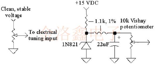 作為一種選擇,可以將振蕩器的內(nèi)部參考電壓引致一個(gè)引腳上,以連接到多圈電位計(jì)以進(jìn)行微調(diào).或者,可以將來(lái)自單獨(dú)電源的干凈DC施加到電調(diào)諧銷上.如果可用電源有噪聲或不穩(wěn)定,則可能需要添加一個(gè)齊納二極管或參考設(shè)備以及一個(gè)低通噪聲濾波器.溫度補(bǔ)償齊納二極管(如1N821)是提供良好溫度穩(wěn)定性和極低噪聲的絕佳選擇(在大多數(shù)情況下),以下所示的22uF濾波電容器可省去.參考設(shè)備具有出色的穩(wěn)定性,但它們通常具有相當(dāng)高的噪聲電壓,因此建議進(jìn)行額外的濾波器. 這里有幾點(diǎn)要考慮: