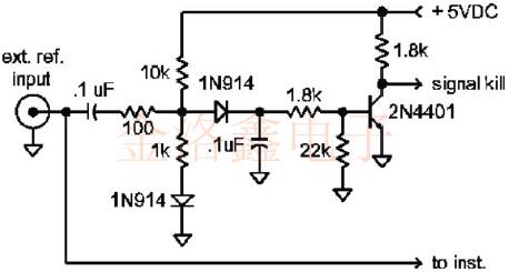 信號(hào)殺死輸入通常接受普通的TTL電平,但可以輕松配置為自定義開關(guān)電平.大多數(shù)信號(hào)殺死輸入均設(shè)計(jì)為在末連接時(shí)浮動(dòng)至"開"狀態(tài),內(nèi)部RC電路可保護(hù)晶振免受可能存在于控制線上有有害電壓或干擾RF信號(hào)的侵害.下面顯示的電路將檢測(cè)到存在大于1伏pp的外部基準(zhǔn),并產(chǎn)生適合驅(qū)動(dòng)大多數(shù)信號(hào)殺死輸入的邏輯"低".該控制信號(hào)還可用于門控儀器電路的外部輸入.該電路設(shè)計(jì)為表現(xiàn)出相當(dāng)高的輸入阻抗,因此在儀器的其他位置假設(shè)電纜端接正確. 如果期望內(nèi)部振蕩器具有比外部基準(zhǔn)更好的短期穩(wěn)定性,則可能需要將內(nèi)部振蕩器相位鎖定到基準(zhǔn).鎖定的振蕩器將表現(xiàn)出內(nèi)部晶體振蕩器的良好短期穩(wěn)定性和外部基準(zhǔn)的良好長(zhǎng)期穩(wěn)定性.一個(gè)簡(jiǎn)單的一階環(huán)路可以由三態(tài)總線設(shè)備或模擬開關(guān)以及一些其他部件組成.基本概念是利用外部參考信號(hào)驅(qū)動(dòng)三態(tài)控制,并使內(nèi)部振蕩器信號(hào)通過(guò)三態(tài)門之一,以便參考信號(hào)對(duì)內(nèi)部振蕩器信號(hào)進(jìn)行采樣.三態(tài)門的輸出經(jīng)過(guò)低通濾波以消除RF頻率,并連接到內(nèi)部振蕩器的電調(diào)諧.偏置三態(tài)控制線,以便在沒有外部基準(zhǔn)時(shí)柵極輸出"浮動(dòng)".當(dāng)沒有外部參考源時(shí),這種高阻抗?fàn)顟B(tài)允許調(diào)諧線被連接到調(diào)諧電位器的高阻值電阻拉動(dòng).74HC244具有兩組四個(gè)三態(tài)緩沖器,是一個(gè)不錯(cuò)的選擇,因?yàn)榭梢允褂梦词褂玫乃膫€(gè)門來(lái)緩沖信號(hào).
