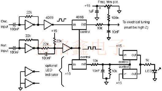 以下電路使用相同的Wenzel晶振技術(shù),僅使用兩個(gè)CMOS器件,一個(gè)4069十六進(jìn)制反相器和一個(gè)4016或4066模擬開關(guān).頻率微調(diào)電位器在不存在基準(zhǔn)的情況下控制頻率.該電路還包括一個(gè)LED驅(qū)動(dòng)器,用于指示外部參考信號(hào)的存在.組分值不是特別關(guān)鍵,并且最佳值將取決于應(yīng)用. 所示電路是具有最高精度振蕩器的一階環(huán)路.例如,一個(gè)10MHz的烤箱振蕩器調(diào)諧靈敏度可能為每伏特1Hz,如果使用15V電源,則相位斜率約為每弧度3伏特.一階環(huán)路的帶寬是調(diào)諧靈敏度和相位斜率的乘積(1Hz/伏×3伏/弧度=3Hz),該斜率遠(yuǎn)低于10K和10nF網(wǎng)絡(luò)的滾降頻率.如果振蕩器具有更高的調(diào)諧靈敏度,則帶寬將成比例地更高,并且可能需要二階響應(yīng)來(lái)減少外部參考噪聲.盡管可以添加傳統(tǒng)的有損集成運(yùn)算放大器類型2電路,在沒有基準(zhǔn)的情況下,有必要采取其他措施來(lái)控制頻率,因?yàn)榉e分器將趨向于漂移至供電軌之一.