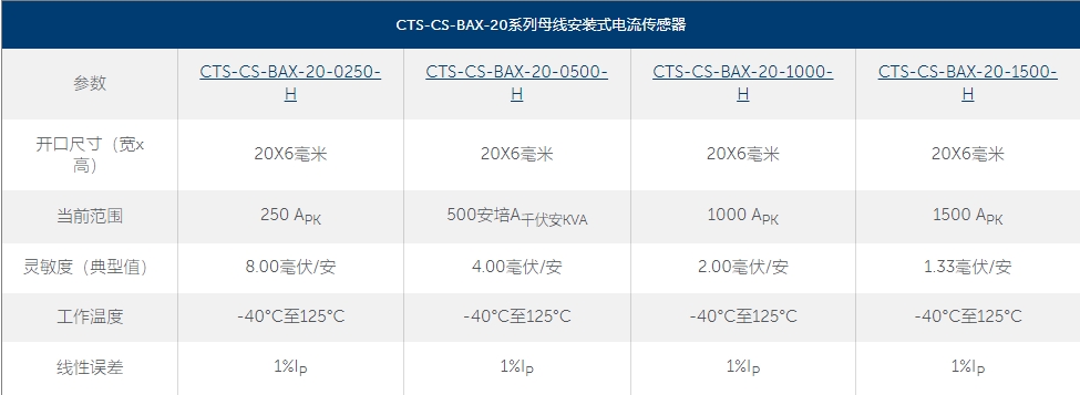 CTS-CS-BAX-20系列母線安裝電流傳感器是美國CTS原裝品牌公司的一款現(xiàn)成解決方案,旨在改善使用母線的電子系統(tǒng)的運行.通過緊密準確地監(jiān)測流經母線的電流,可以優(yōu)化系統(tǒng)性能并檢測潛在的故障.作為現(xiàn)成的選項,CTS-CS-BAX-20校準到四個電流范圍之一,高達1500安培.完整的傳感器模塊由一個開環(huán)霍爾效應傳感器組成,該傳感器封裝在具有高磁導率的軟鐵磁性屏蔽中,以吸收磁場并保護傳感精度.非侵入式,電氣隔離且體積小巧的母線安裝電流傳感器易于安裝,并能立即提供高精度的交流(AC)和直流(DC)電流讀數(shù).它還具有出色的輸出線性以及低熱偏移和靈敏度漂移,使其能夠在廣泛的溫度范圍內按預期運行.CTS-CS-BAX-20由于采用了模塊化設計方法,易于組裝并批量生產,同時也為客戶提供多種預設構建模塊的選擇.這確保了我們的交貨時間盡可能短,而不會降低產品的設計靈活性和廣泛適用性.