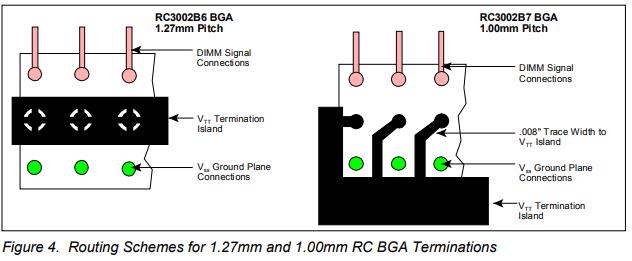 終端電阻應(yīng)盡可能靠近雙列直插式內(nèi)存模塊(DIMM)插槽,以最大限度地減少信號路由長度。如果使用電阻陣列或僅帶終端電阻的BGA網(wǎng)絡(luò),雙通電容應(yīng)放置在VTT終端島和VSS平面之間,每兩個終端電阻至少有一個0.01μF電容,間隔均勻。采用任何一種端接方法,PCB應(yīng)在端接島的每端包含一個10μF鉭電容,用于批量去耦。圖3顯示了采用帶終端電阻和雙極電容的BGA封裝的完整終端解決方案示例。