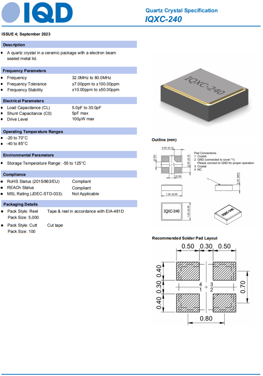 Housed in a 4-pad ceramic hermetically sealed package with an electron beam sealed metal lid, which helps to minimise the EMI radiation. The product is designed to be able to withstand shock levels of up to 1000G in accordance with IEC 60068-2-27. The IQXC-240 is available on tape and reel in accordance with EIA-481D.