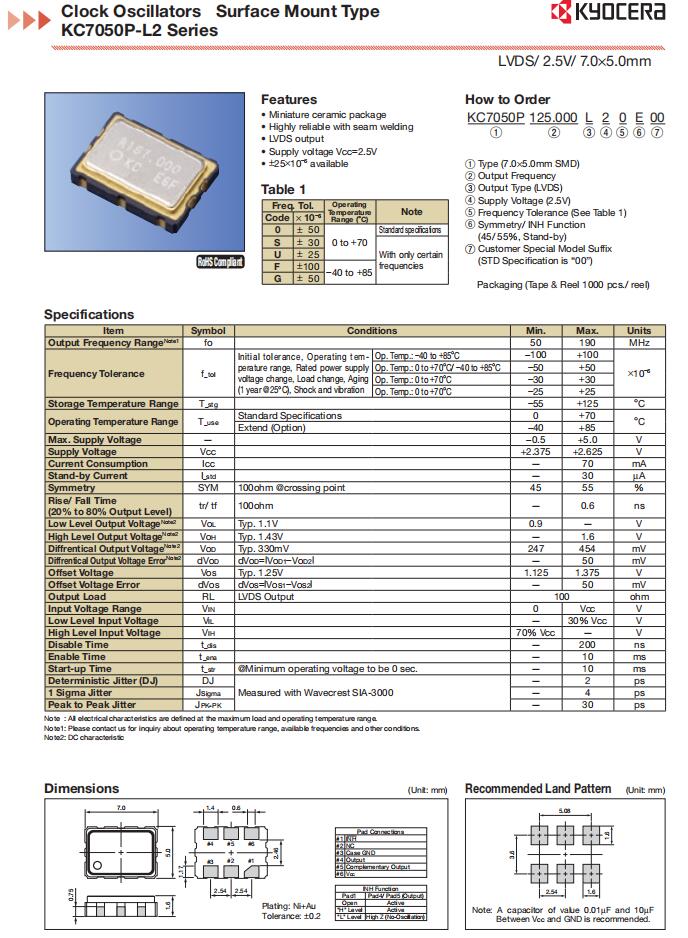 | KC7050Y125.000P20EZU | AVX Corp/Kyocera Corp | KC7050Y-P20EZU | 125MHz | 2.5V | 0°C ~ 70°C |