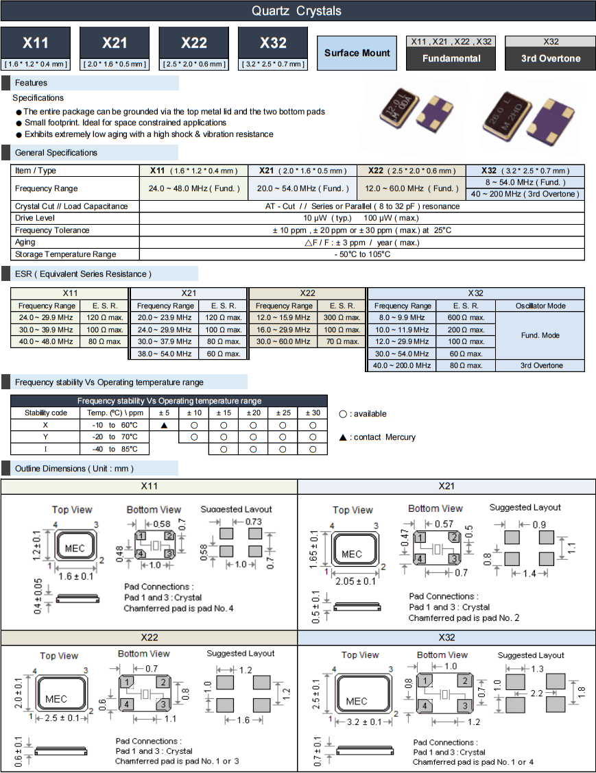 | 項(xiàng)目/型號 | X11 ( 1.6 * 1.2 * 0.4 mm ) | X21 ( 2.0 * 1.6 * 0.5 mm ) | X22 ( 2.5 * 2.0 * 0.6 mm ) | X32 ( 3.2 * 2.5 * 0.7 mm ) |