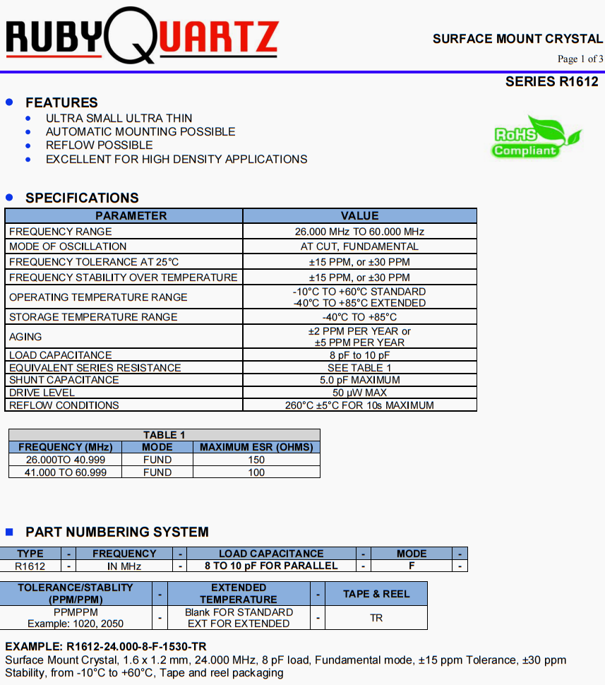 R1612-20.000-8-F-1530-TR晶振,rubyquartz超小型晶體,宇宙空間站晶振,美國(guó)rubyquartz晶振公司,高精度晶振,無(wú)源晶振,貼片晶振,高精度晶振,6G通訊設(shè)備晶振,無(wú)線傳輸晶振,局域網(wǎng)晶振,5032晶振,高品質(zhì)晶振,SMD晶振,石英晶振,小體積晶振,低損耗晶振 ,北斗衛(wèi)星定位模塊晶振,6G無(wú)線網(wǎng)晶振,高精度晶振。特點(diǎn):超小型超薄,可自動(dòng)安裝,可回流,適用于高密度應(yīng)用,應(yīng)用:尋呼機(jī),無(wú)繩電話,GPS,藍(lán)牙